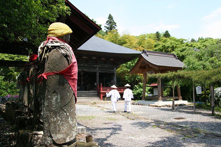 The Chichibu pilgrimage route is one part of the 100 Kannon Pilgrimage, three connected paths that link 100 temples across the regions of Chichibu, Bandō, and Saikoku. The 100 Kannon Pilgrimage route stretches some 1,200 kilometers, from Seigantoji Temple in Wakayama Prefecture to Suisenji Temple in the town of Minano, near Chichibu. Each of the temples along the route enshrine a statue of the bodhisattva Kannon, Goddess of Compassion. A stele discovered in the ruins of Iwao Castle, in Nagano, is inscribed with writing that indicates pilgrims have been traveling the route since at least 1525. However, the route may have existed even centuries earlier. A collection of folktales from the Heian period (794–1185) mentions a “man who cleansed himself and made offerings at 100 shrines to Kannon on the eighteenth of each month.”