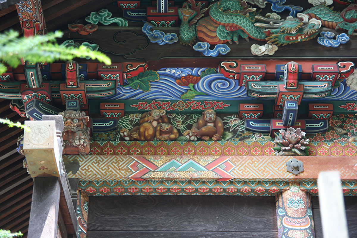 The west side of the shrine building is decorated with a carving of a trio of monkeys who lounge just below the eaves. Unlike the traditional three wise monkeys (sanzaru) who “hear no evil,” “see no evil,” and “speak no evil”—a common motif in Japanese Buddhist art—Jingorō has carved the “three rowdy monkeys” (ogenki sanzaru) who “listen closely,” “look intently,” and “speak clearly.” Whether rowdy or wise, the monkeys are generally thought to be wards against evil and misfortune.