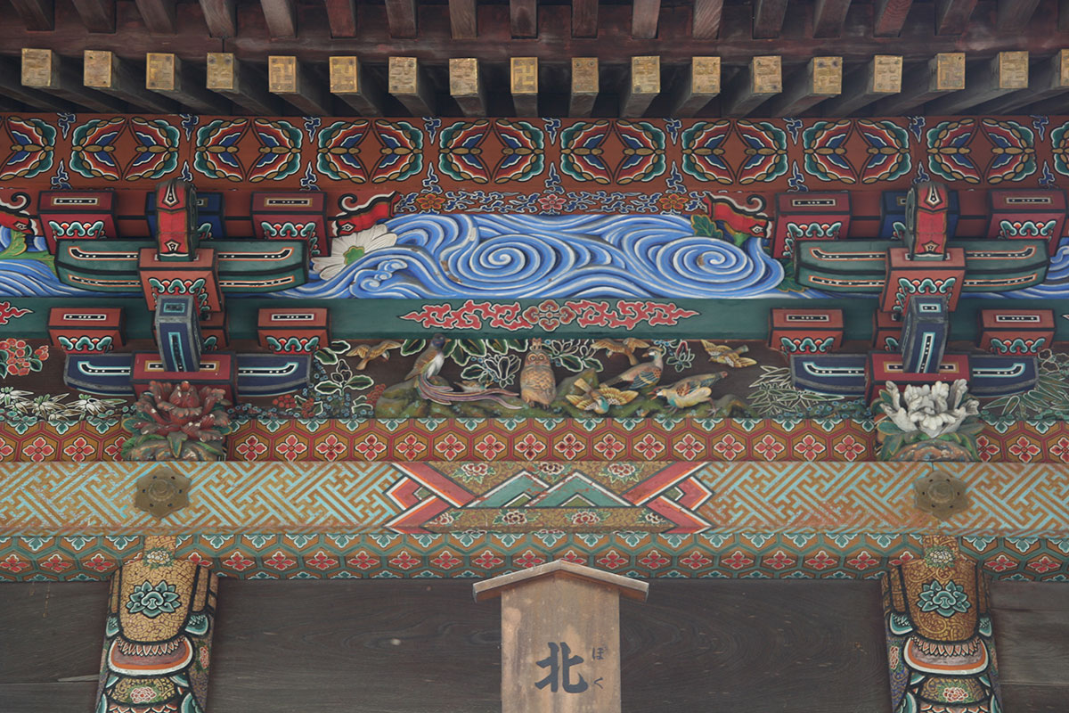 The front (south) side of the shrine is decorated with myriad colorful carvings. Of particular note are the tigers just under the eaves on either side. These tigers, called the “child-rearing tigers” (kosodate no tora), were included in recognition of Tokugawa Ieyasu's patronage. Supposedly, the warlord was born in the year, day, and hour of the tiger. Oddly, a leopard is portrayed among the tiger cubs. Tigers are not native to Japan, and by the early seventeenth century, when the carving was made, it was still not known exactly what female tigers looked like. Evidently, Jingorō saw a leopard and assumed it was a female tiger, and this became the reference for his carving.