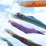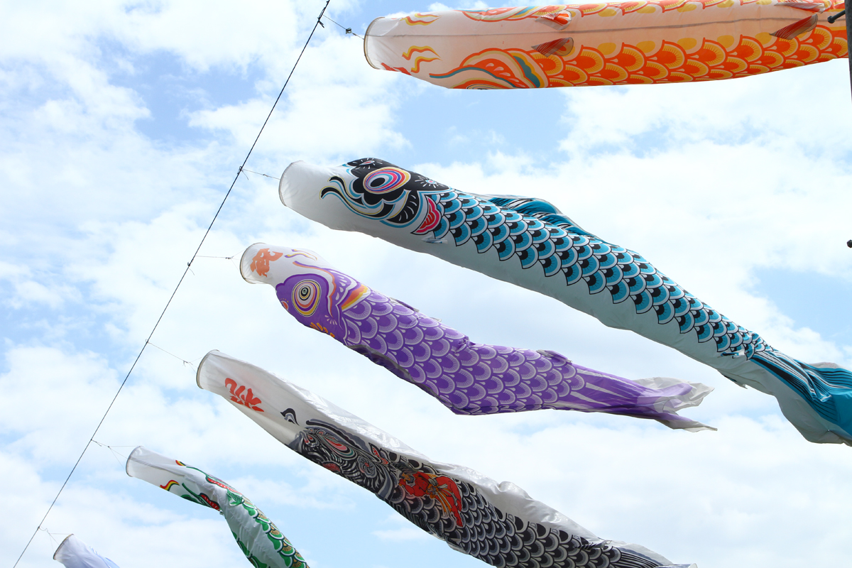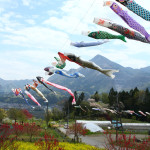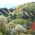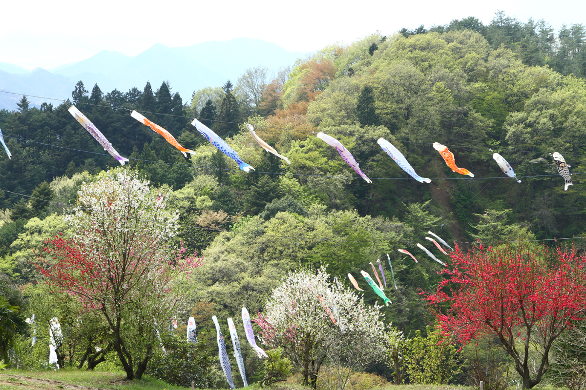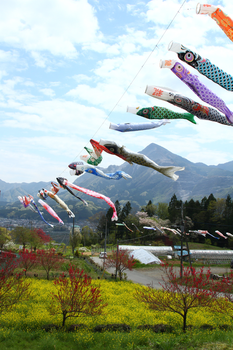 From the high ground that looks upon the town areas, enjoy the view of carp streamers swimming full of spirit against the backdrop of Buko-zan Mountain.