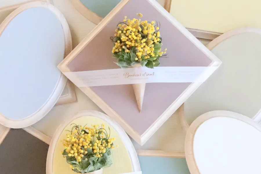「秩父夜街 彩さんぽ」特別ワークショップ。真珠のように愛らしいパールアカシアを使いお好みのカラフルボードを選んで仕立てるボードブーケレッスン。完成した作品はご自宅に飾って春をお楽しみいただけます。