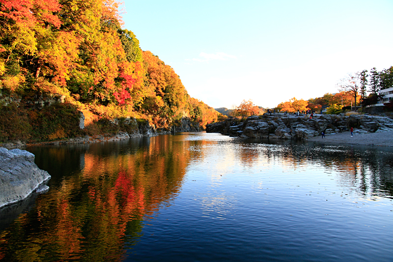 나가토로 계곡은 총 길이가 약6km에 달하며 명승•천연 기념물로 지정되어 있습니다. 그 중에서 「나가토로 이와다타미(암석단구)」는 아라 강을 따라 폭 80m, 길이 500m에 걸쳐 암석이 노출되어 있는데, 일면에 다다미를 깔아 놓은 것처럼 보여서 「이와다타미」라고 불리고 있습니다. 나가토로 계곡에서는 지각변동이나 강의 침식 작용으로 생긴 자연의 조형미를 곳곳에서 만날 수 있습니다.