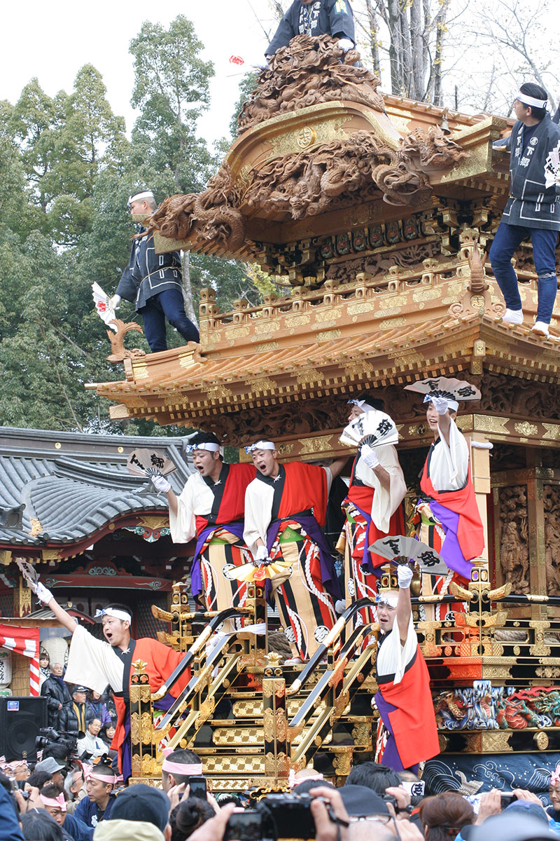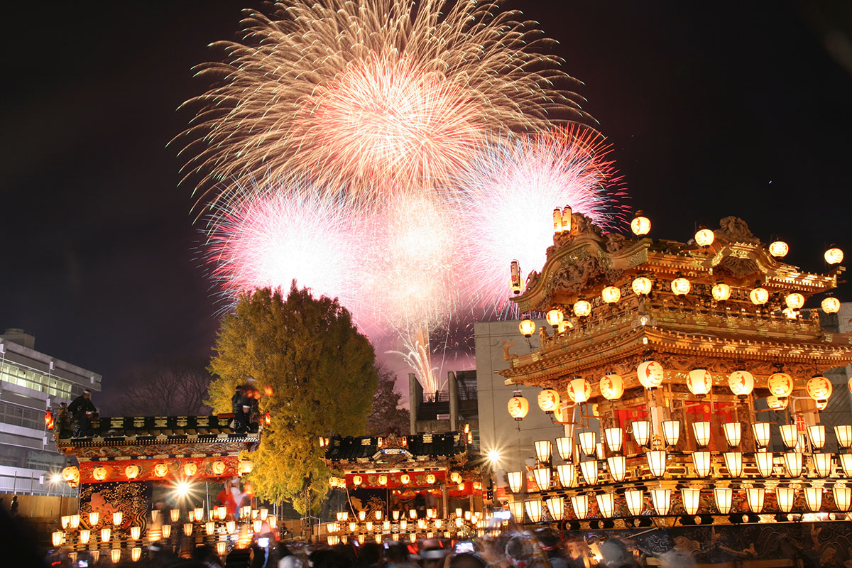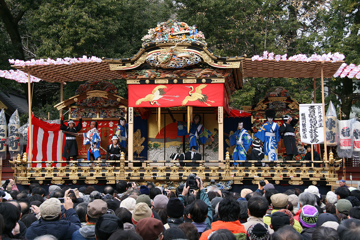 秩父夜祭於每年12月2日和3日舉辦,是向秩父神社中供奉的神靈表達敬意的祭典。夜祭期間,六台「山車」(花車)於神社一帶巡遊。眾人合力拉拽山車行至各停留點時,山車內的舞台便上演鼓笛奏樂「屋台囃子」、祭典神樂「曳踴」和歌舞伎。其中兩台掛滿燈籠的「笠鉾(花之陽傘)」山車上,立著一把以花朵製成的神傘,其貫穿傘蓋的傘柄稱「鉾」,被視為神靈的化身。另外四台則載有「屋台囃子」奏樂班。該祭典以現有形式已延續300多年,被視為「日本三大曳山祭」(日本三大山車祭)之一。