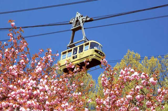 標高497メートルの宝登山(ほどさん)に架設されている宝登山ロープウェイは、 山麓駅から山頂駅までの全長832mを約5分間で結び、2台のゴンドラ(50名様乗り)が、山頂駅と山麓駅をつるべ式に往復する四線交走式システムで運転を行っています。